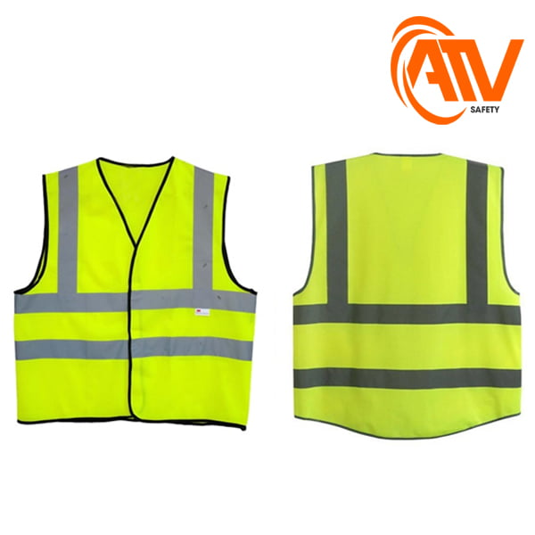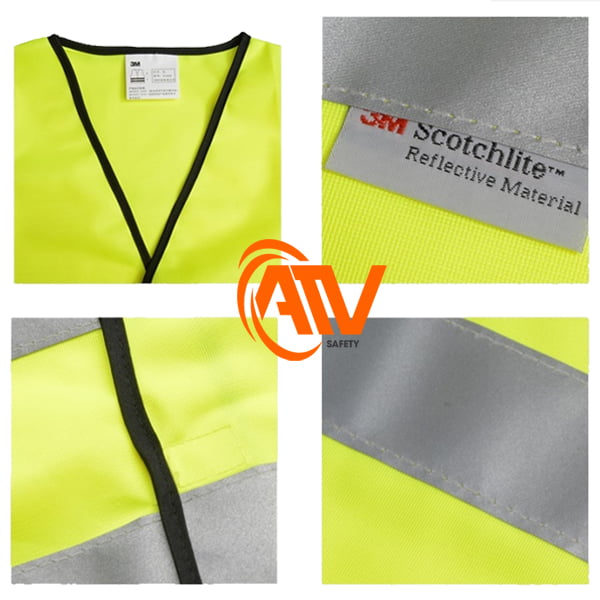 Thiết kế: Áo cổ V, 2 dây phản quang ngang ngực, 2 dây phía sau lưng. Có khóa kéo và viền đen.