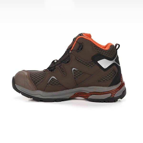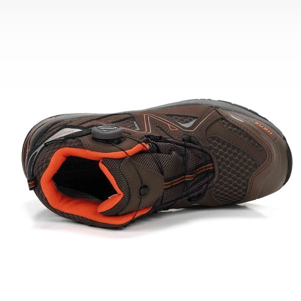 Thân giày được làm từ Aldo kết hợp với vải lưới giúp tăng cường độ thoáng khí, mang lại sự thoải mái trong điều kiện làm việc nóng bức. Thiết kế màu nâu sẫm kết hợp với các đường viền màu cam và vàng nổi bật tạo nên vẻ ngoài thời trang và chuyên nghiệp.
