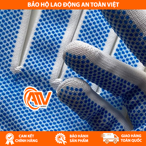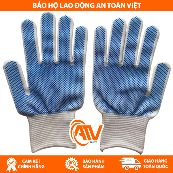 Thiết kế: Kiểu dệt kim, hạt nhựa PVC phủ toàn bộ lòng bàn tay, cổ tay bo chun hoặc dệt kim