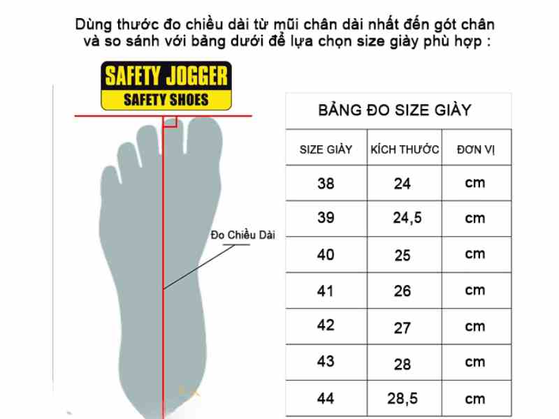 - Tham khảo bảng size chuẩn từ Safety Jogger: Mỗi thương hiệu giày sẽ cung cấp một bảng size chuẩn, nơi bạn có thể tìm thấy size phù hợp dựa trên chiều dài và chiều rộng của chân.