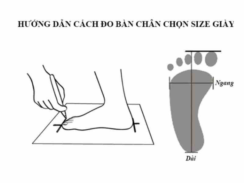 - Đo chiều dài và chiều rộng: Sau khi vẽ, sử dụng thước dây để đo chiều dài từ ngón chân dài nhất đến gót chân và chiều rộng ở phần rộng nhất của bàn chân.